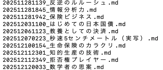_scriptsたとえば、00-literature-notes フォルダには以下のような YYYYMMDDHHmm-ファイル名.md 形式のタイムスタンプ付きファイルが保存されている。