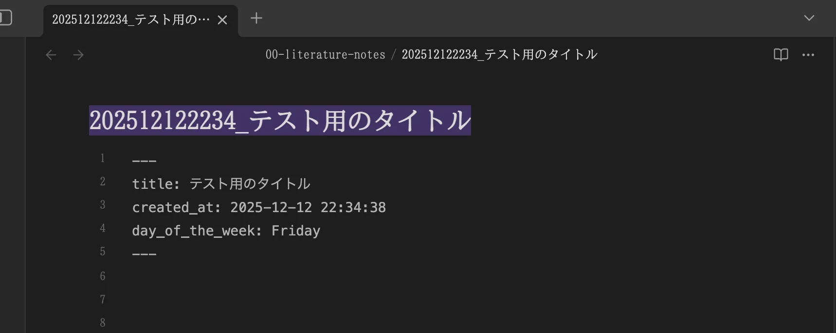 なお、時系列で並べつつ自然言語のタイトルも保持することは、フロントマターに加えて、なんらかのコミュニティプラグインや Bases プラグインを使えばできそうだが、他のファイルビュワーなどで開いたときもわかりやすいように、ファイル名にタイムスタンプを付与する方法を採用している。
